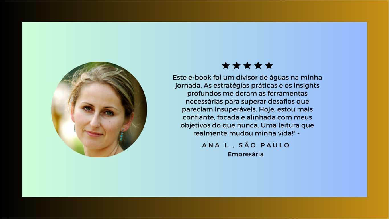 "Adquiri este e-book em um momento de incerteza sobre minha carreira. Ele me guiou na definição de metas claras e na criação de um plano de ação. Estou muito feliz em compartilhar que agora tenho um emprego que amo e estou trilhando meu caminho para o sucesso profissional."